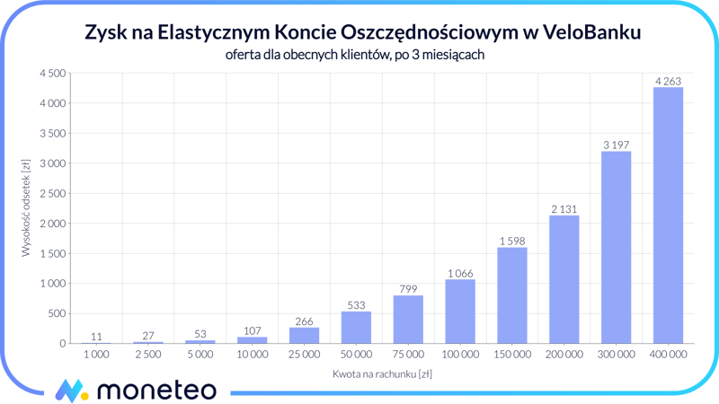 Oto zysk, na jaki mogą liczyć obecni klienci VeloBanku po wpłacie nowych środków na Elastyczne Konto Oszczędnościowe – 5,2% po 3 miesiącach – dla różnych kwot do wysokości 400 tys. zł. Podane wartości odsetek są zaokrąglone do pełnych złotych i uwzględniają już należny podatek od zysków kapitałowych.