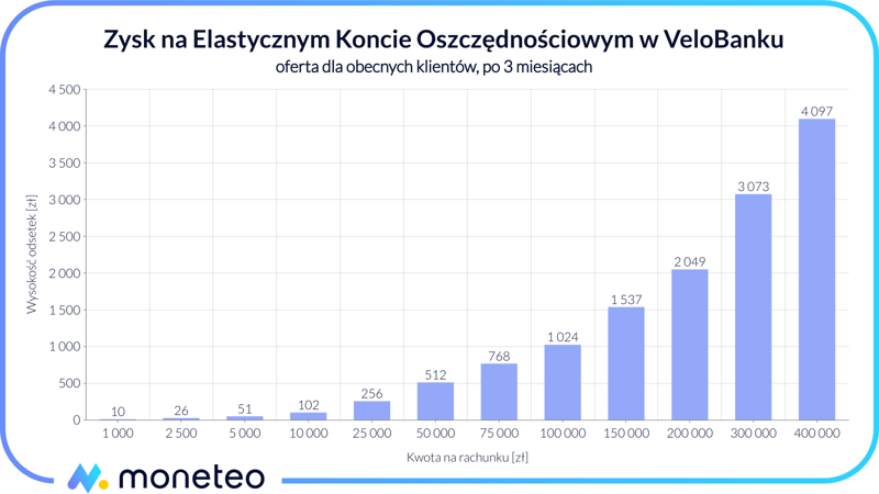 Oto zysk, na jaki mogą liczyć obecni klienci VeloBanku po wpłacie nowych środków na Elastyczne Konto Oszczędnościowe – 5% po 3 miesiącach – dla różnych kwot do wysokości 400 tys. zł. Podane wartości odsetek są zaokrąglone do pełnych złotych i uwzględniają już należny podatek od zysków kapitałowych.